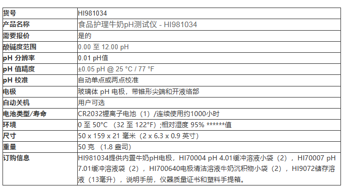 HI981034提供内置牛奶pH电极,HI70004 pH 4.01缓冲溶液小袋(2),HI70007 pH 7.01缓冲溶液袋(2),HI700640电极清洁溶液牛奶沉积物小袋(2),HI9072储存溶液(13毫升),说明手册,仪器质量证书和塑料手提箱。