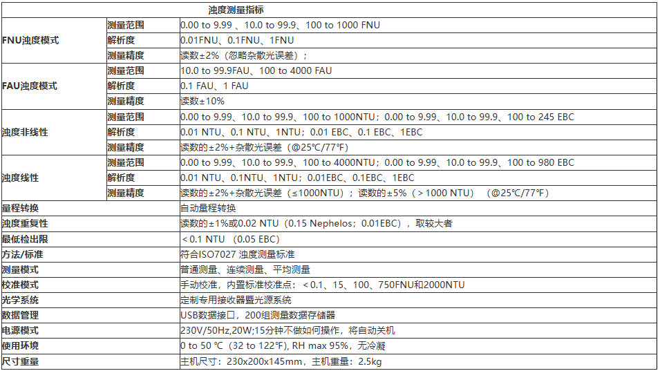 主机,HI88713-11 定制专用浊度(ISO)标准组(标值@25°C:≤ 0.1、15、100、750 FNU和 2000 NTU),HI731333N 专用玻璃比色皿套装(6个),HI710006 AC230V/12VDC 电源适配器,中英文使用说明书【温馨提示:建议订购HI93703-50比色皿清洁液和HI731318玻璃比色皿清洁布,用于玻璃比色皿清洁修复,确保测量精度和读数准确度】