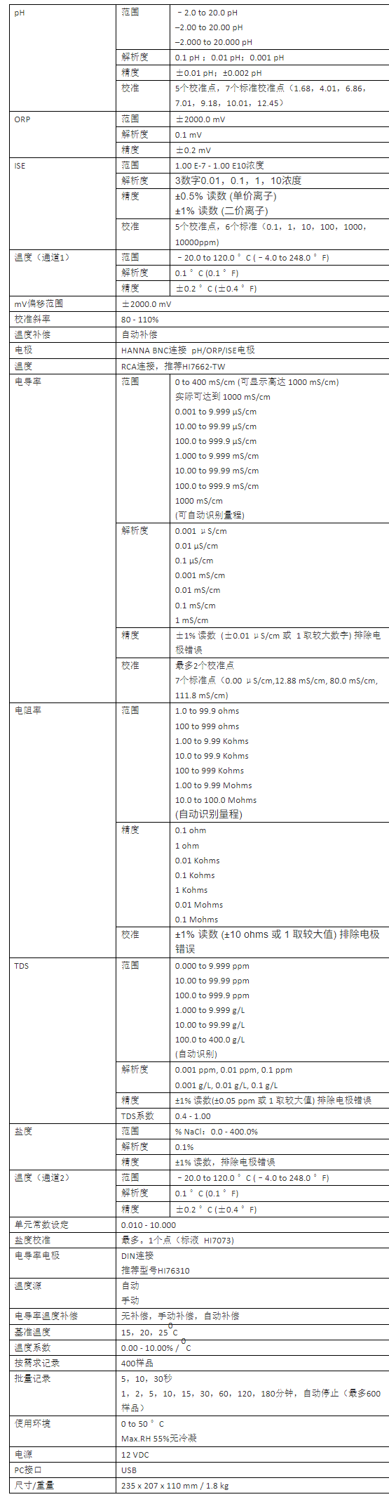 pH范围:–2.0 to 20.0 pH ; –2.00 to 20.00 pH ; –2.000 to 20.000 pH