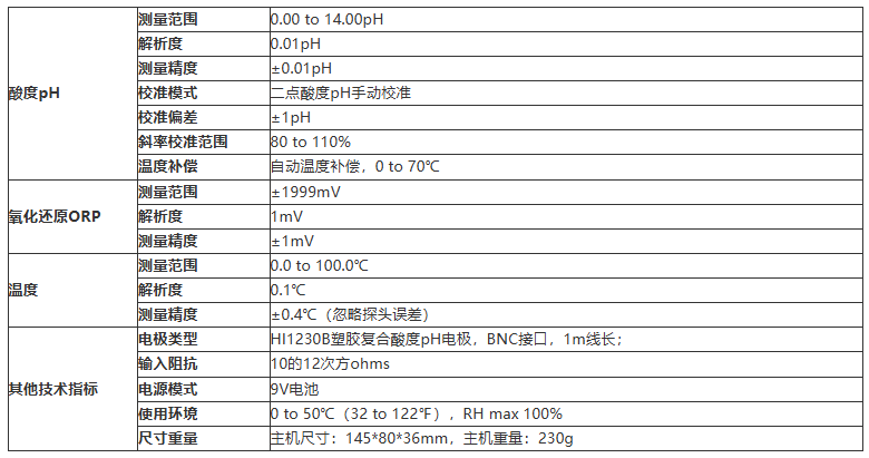 酸度pH: 0.00 to 14.00 pH;氧化还原 ORP : ±1999 mV