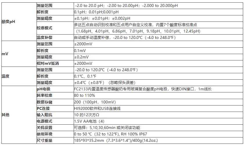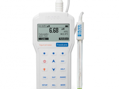 HI98164便携式酸奶行业量身定制酸度pH分析测定仪。尤其适用酸奶、酸奶制品、奶类等食品检测。IP67 防水设计,采用FC2133内置温度传感器酸奶专用玻璃复合酸度电极,体 速DIN防水接口,连接快速安全。内置七个标准校准点pH1.68、4.01、 6.86、7.01、 9.18 10.01、12.45 和五个用户自定义校准点,可避免校准错误。