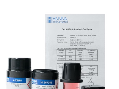 余氯-总氯NIST测量曲线标定组,标准值@25ºC:0.00 and 4.00±0.20 ppm(mg/L)CI2,密封比色皿和分析证书组成