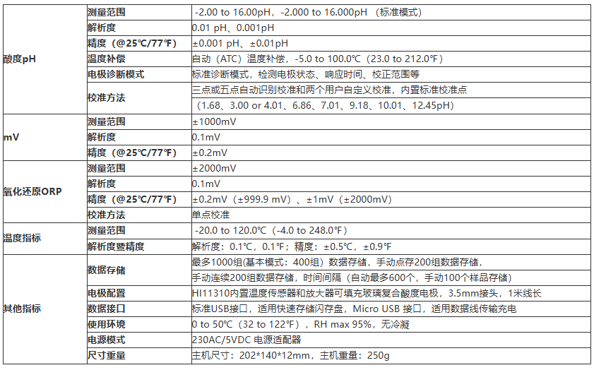 酸度pH:-2.00 to 16.00 pH、 -2.000 to 16.000 pH;pH-mV转换:±1000 mV;ORP:±2000 mV