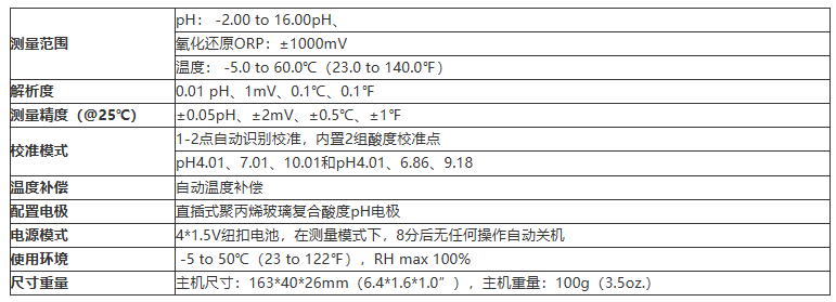 测量范围:-2.00 to 16.00 pH,± 1000 mV【ORP】,-5.0 to 60.0°C 、23.0 to140.0°F;