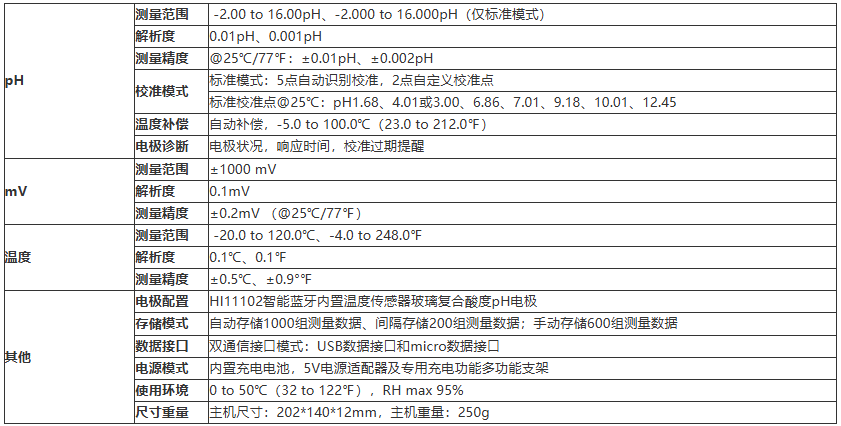 主机、台式基座与电极支架、壁挂式底座、HI11102智能蓝牙内置温度传感器玻璃复合酸度pH电极、USB数据线、5V DC电源适配器、中英文说明书