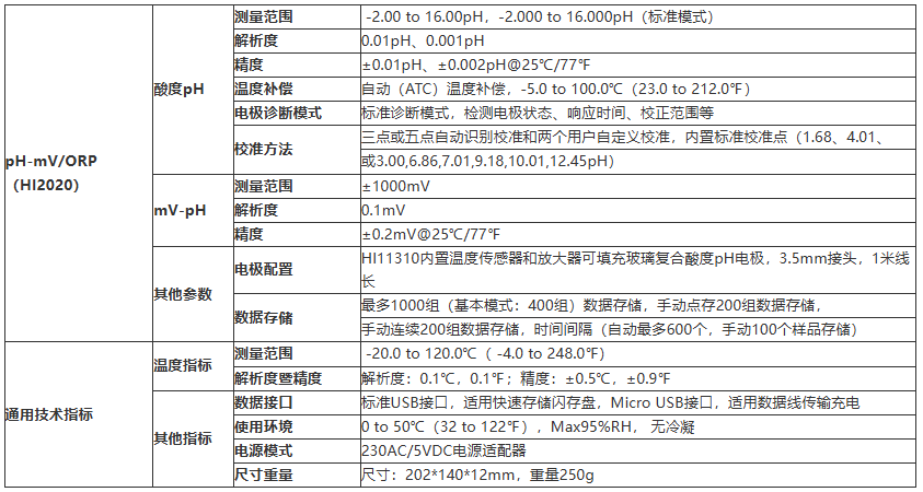 酸度pH:-2.00 to 16.00 pH、 -2.000 to 16.000 pH,pH-mV转换:±1000 mV;