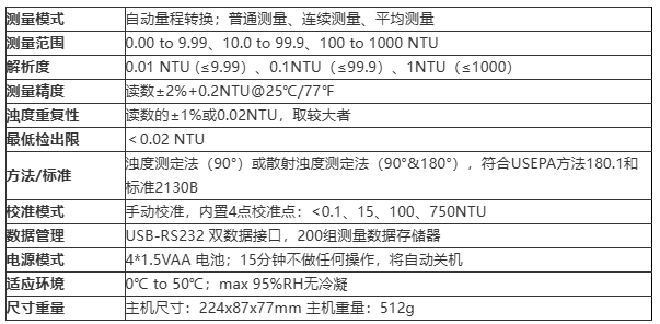 便携式高精度,多量程浊度测定仪。大号样品比色皿配合优良光学系统,微处理器通过到达检光器的光强计算出浊度值;修正了颜色的干扰,具有色度补偿、光源自动补偿功能,避免了光源波动引起的干扰,无需频繁校准。尤其适用于低量程浊度高精度测量,适用于水质监测,废水等领域,可做现场便携式或实验室台式使用。