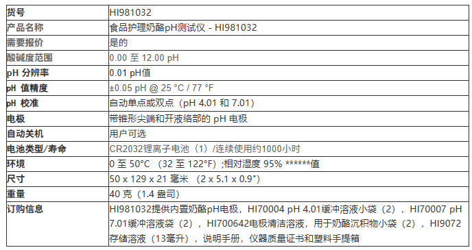 HI981032提供内置奶酪pH电极,HI70004 pH 4.01缓冲溶液小袋(2),HI70007 pH 7.01缓冲溶液袋(2),HI700642电极清洁溶液,用于奶酪沉积物小袋(2),HI9072存储溶液(13毫升),说明手册,仪器质量证书和塑料手提箱