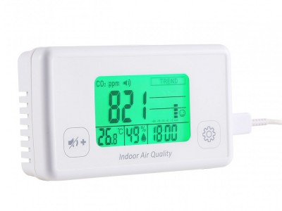 大LCD显示CO2值.湿度.温度,当前CO2等级指标良好/正常/不良,过去24小时的CO2趋势和时分时钟