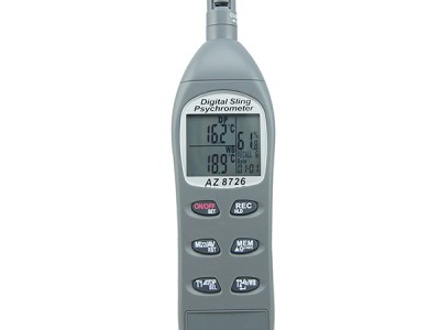 8726 AZ衡欣 便携式温湿度测试仪可以测量空气温度,外部温度,相对湿度,露点温度和湿球温度.它的相对湿度传感器可以使用33%和75%的盐瓶轻松校准.