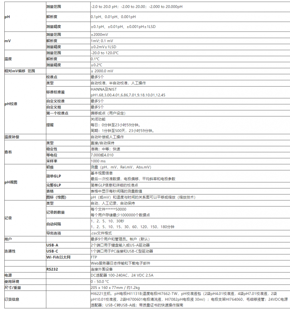 HI6221主机,pH电极HI1131B;温度电极HI7662-TW,pH校准液包(2袋pH4.01校准液,4袋pH7.01校准液,2袋pH10.01校准液,2袋HI700601电极清洗液,HI7082pH电极液 30ml);电极支架HI764060,毛细移液管;24VDC电源适配器;USB-C转USB-A线;带质量证书的快速操作指南