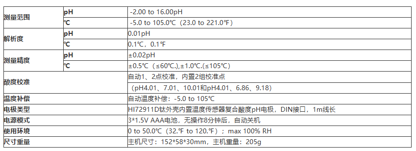主机、HI72911D内置温度传感器钛外壳复合酸度pH电极、中英文使用说明书
