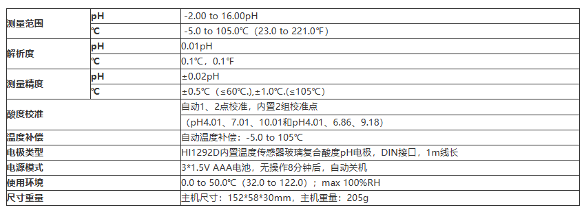 pH范围:-2.00 to 16.00pH;pH-mV转换:±825 mV;温度:-5.0 to 105.0°C; 23.0 to 221.0°F