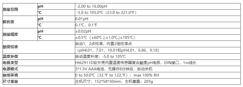 主机、HI62911D内置温度传感器钛外壳复合酸度pH电极、中英文使用说明书