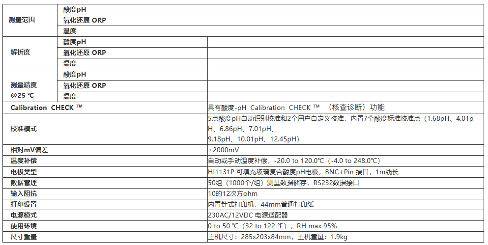 新款外观设计,随屏校准操作步骤提示,自动数据存储,自动终点锁定模式和用户自定义设置功能,Calibration Check™核查功能,确保校准暨电极状态最佳,GLP管理功能,快速查询当前数据与历史数据,具有自动(ATC)或手动(MTC)温度补偿,5点pH自动识别校准,内置7个标准点、2个自定义校准,内置针式打印机,使用44mm普通纸,快速对测量数据记录,50组(1000个/组)测量数据储存,RS232数据接口,卓越数据管理。