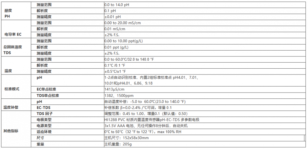 主机 HI991300或HI993301、HI1288 专用内置温度传感器 pH-EC-TDS 多参数电极、酸度-电导率标准缓冲液套装、中英文说明书