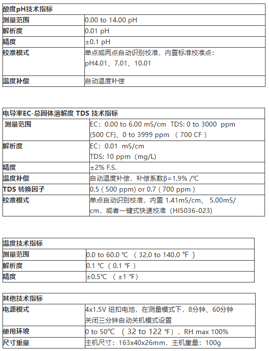 酸度pH:0.00 to 14.00 pH,温度:0.0 to 60.0 °C、32.0 to 140.0 °F