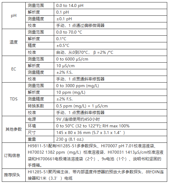HI9811-51配有HI1285-51多参数探头、HI70007 pH 7.01校准溶液袋、HI70032 1382 ppm(mg/L)校准溶液袋,HI70031 1413µS/cm校准溶液袋和HI700661电极清洁溶液袋(2个)、9v电池(1个)、说明书和坚固的手提箱。