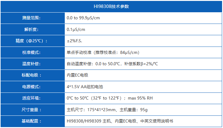 HI98308(PWT)用于监测去离子水,蒸馏水,矿泉水。