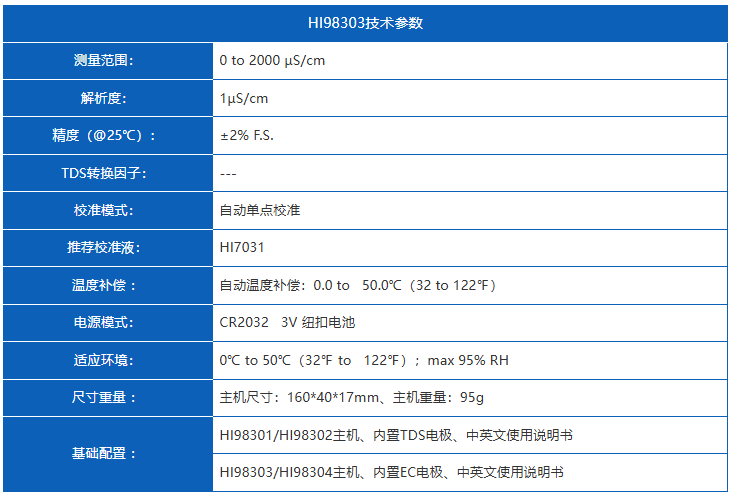 新款外观设计,超大双行屏幕显示,操作便捷,自动识别单点【标准点@25°C:1413μS/cm,推荐HI7031】识别校准,自动温度补偿,确保测量高精度数据和测量数据可靠性;