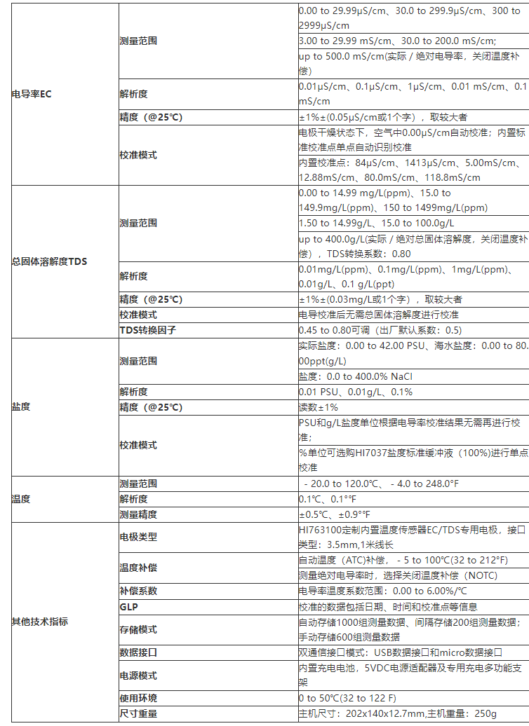 主机,HI763100内置温度传感器四环铂金EC-TDS电极,电导率标准缓冲液套装(标准值@25°C:1413 µS/cm 、12880 µS/cm和定制专用电极清洗液,规格:20mL×3),定制专用电极支架,AC230V/5VDC 定制专用电源适配器,中英文使用说明书
