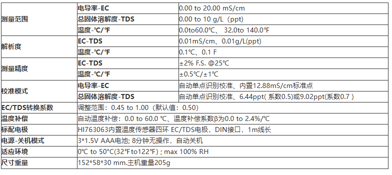 主机,HI763063 内置温度传感器EC-TDS电极,DIN快速防水接口,1 m (3.3’) 线长,EC-TDS标准液套装,标准值(@25°C):12.88mS/cm、6.44 g/L (ppt),规格20mL×2,中英文使用说明书,HI7209913 定制专用仪器携带箱
