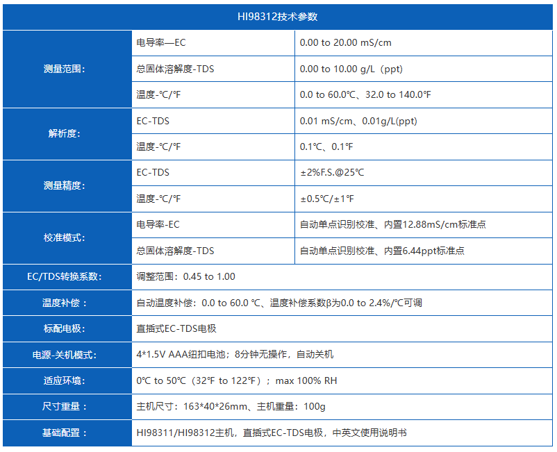 电导率EC:0.00 to 20.00 mS/cm、总固体溶解度TDS:0.00 to 10.00 ppt(g/L)