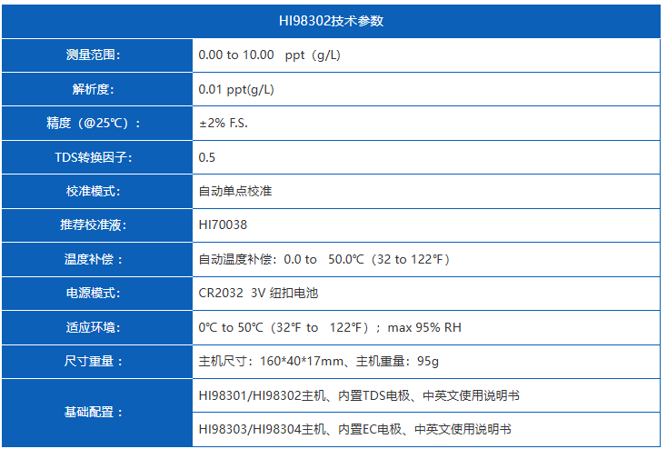 总固体溶解度【TDS】:0.00 to 10.00 ppt(g/L),温度:0.0 to 50.0°C、32.0 to 122.0°F
