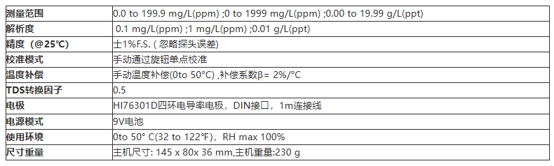 三个总固体溶解度测量量程分别对应三个按钮,不同测量范围轻松切换。测量多个不同样品时无需频繁更换电极和进行繁琐的校准步骤。手动单点TDS校准,手动温度补偿旋钮,对测量读数进行温度补偿,保证测量准确操作便捷。适配独特HI76301D四环电导率电极,采用PVC材质,不仅适用于实验室,也适用于野外测量。是水调节领域,水质软化、反渗透、除盐(脱矿质)以及饮用水领域总固体溶解度TDS测定的良好选择。