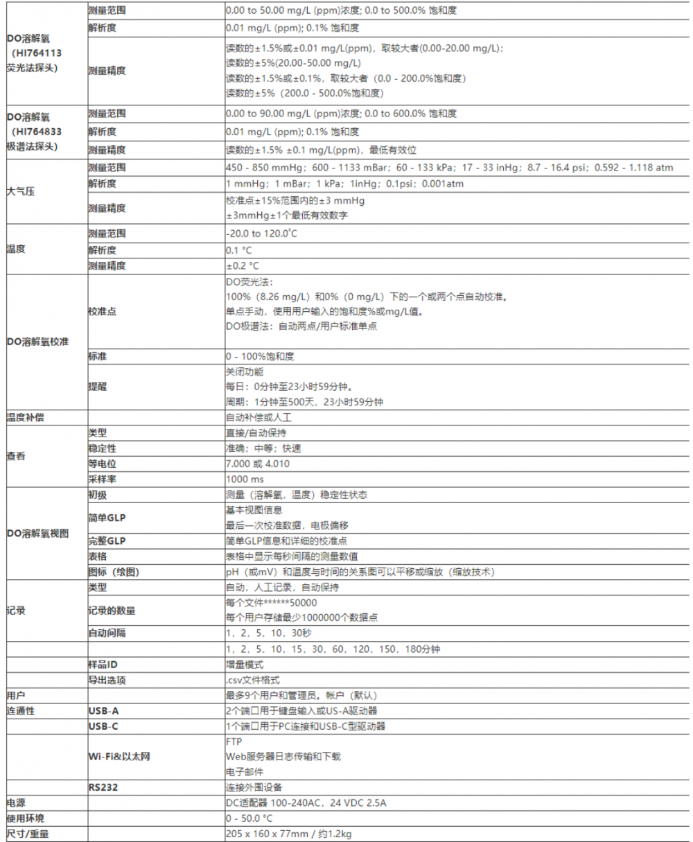主机,溶解氧电极HI7641133;电极支架HI764060,24VDC电源适配器;USB-C转USB-A线;带质量证书的快速操作指南