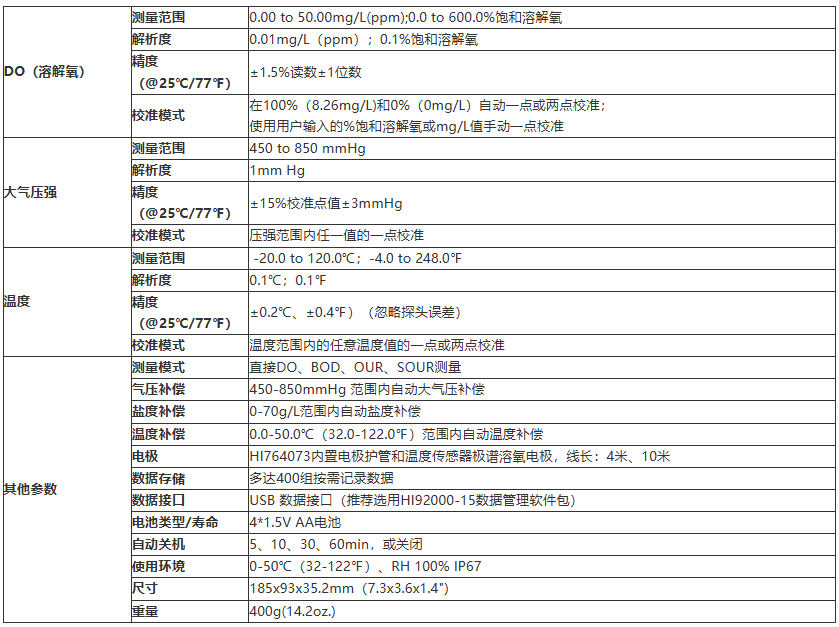 大量程、溶解氧50.00 mg/L ( ppm)、 饱和溶氧600.0%