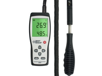 温湿度计是用于测量溫度及水分在大气中的含量。快速、方便、精确地测量空气中的湿度和温度读数。湿度测量仪器通常依靠如温度、压力测量、质量、机械或电气变化的物质中的水分吸收量來测量湿度,再通过校验和计算來獲取湿度测量数據。现代电子设备中使用电变化电容或电阻测量湿度的差异。应用在实验设备、工业、工程生产和专业用途,都是一个理想的湿度和温度计量器。
