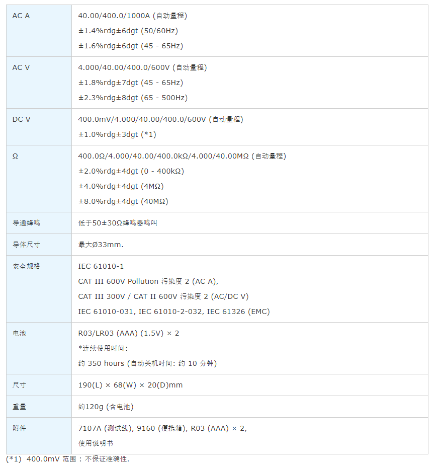 • Ω/导通蜂鸣功能中无熔丝电子保护可达600V