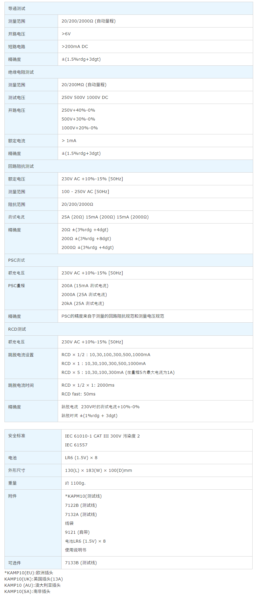 • 回路电阻和PSC测试:200Ω/2000Ω量程中使用15mA测试电流(无RCD跳脱)
