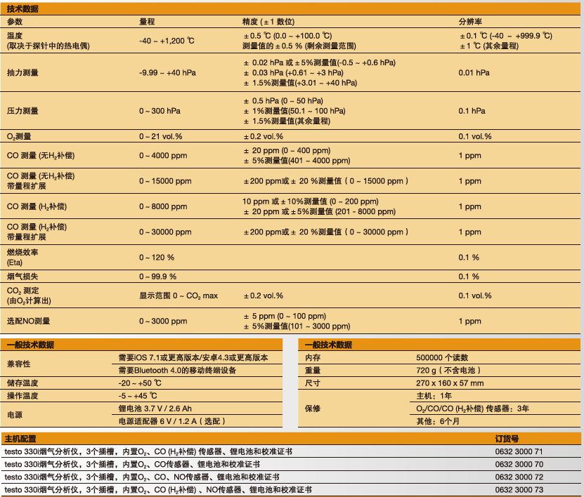 testo 330i 烟气分析仪配备长寿命传感器,3个插槽,以及集成式气流和气体调零。包括O2,CO传感器,可充电电池以及校准证书。