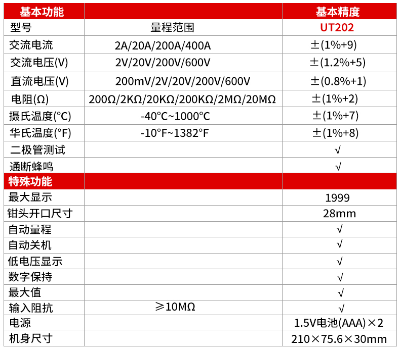 UT201、UT202是一种性能稳定,安全、可靠的3 1/2位数字钳形表(以下简称钳表)系列。整机电路设计以大规模集成电路双积分A/D转换器为核心,全量程的过载保护电路,独特的外观设计使之成为性能优越的专用电工仪表。钳表可用于测量交直流电压、交流电流、电阻、二极管、电路通断、℃/°F温度等