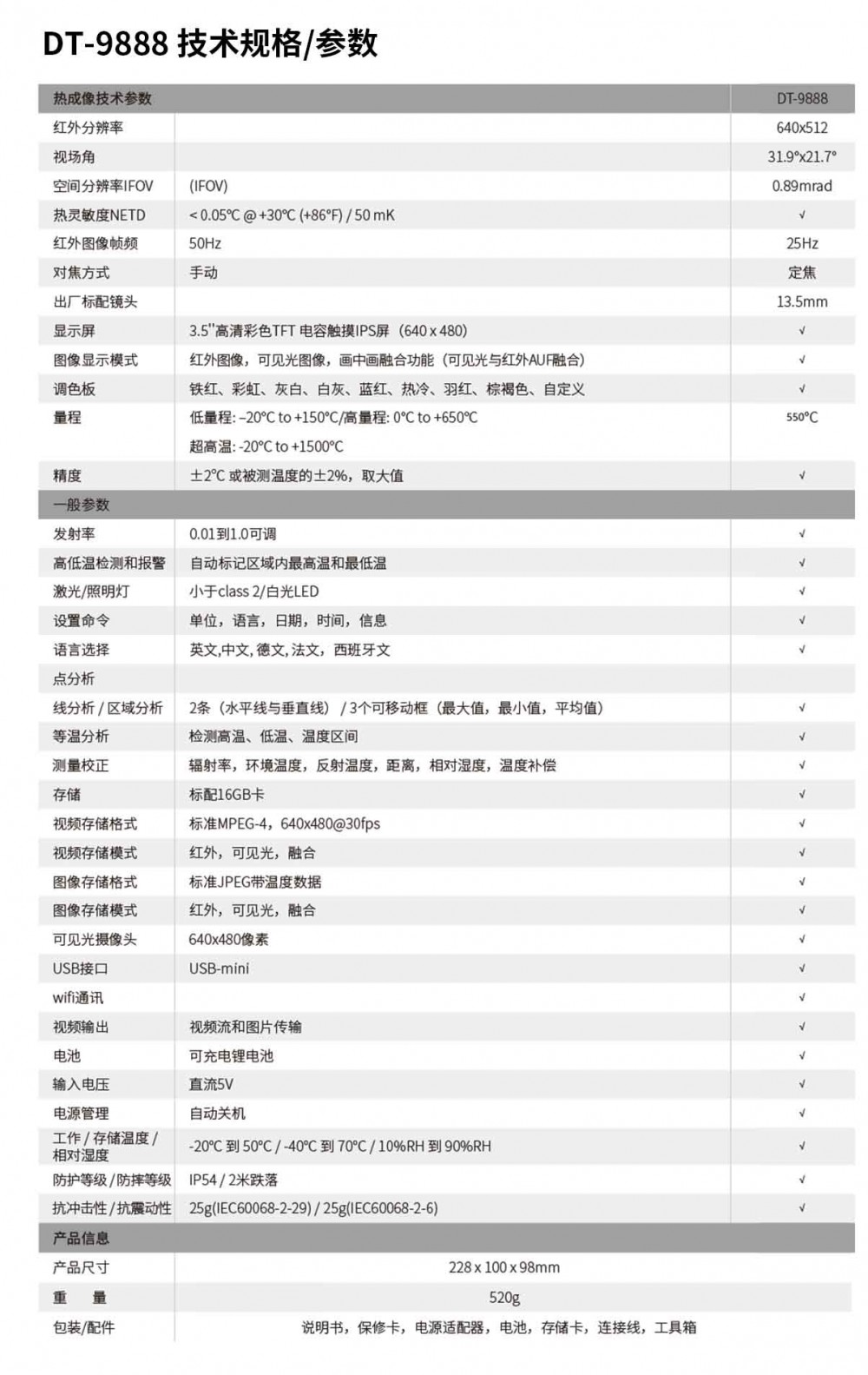 DT-9888是CEM华盛昌自主设计、研发和推出的智能型专业级红外热像仪,640*512高红外分辨率,具有25Hz红外帧频分辨率,温感成像更灵敏、清晰;双注塑机壳、IP54防水防尘、坚固耐用并能适用于多种测电气维护、轨道交通、设备温环境:多种通讯功能,能及时记录测量温感现场的情况,并进行保存和分析;广泛应用于电力建设和维护、故障维修、暖通空调等行业。
