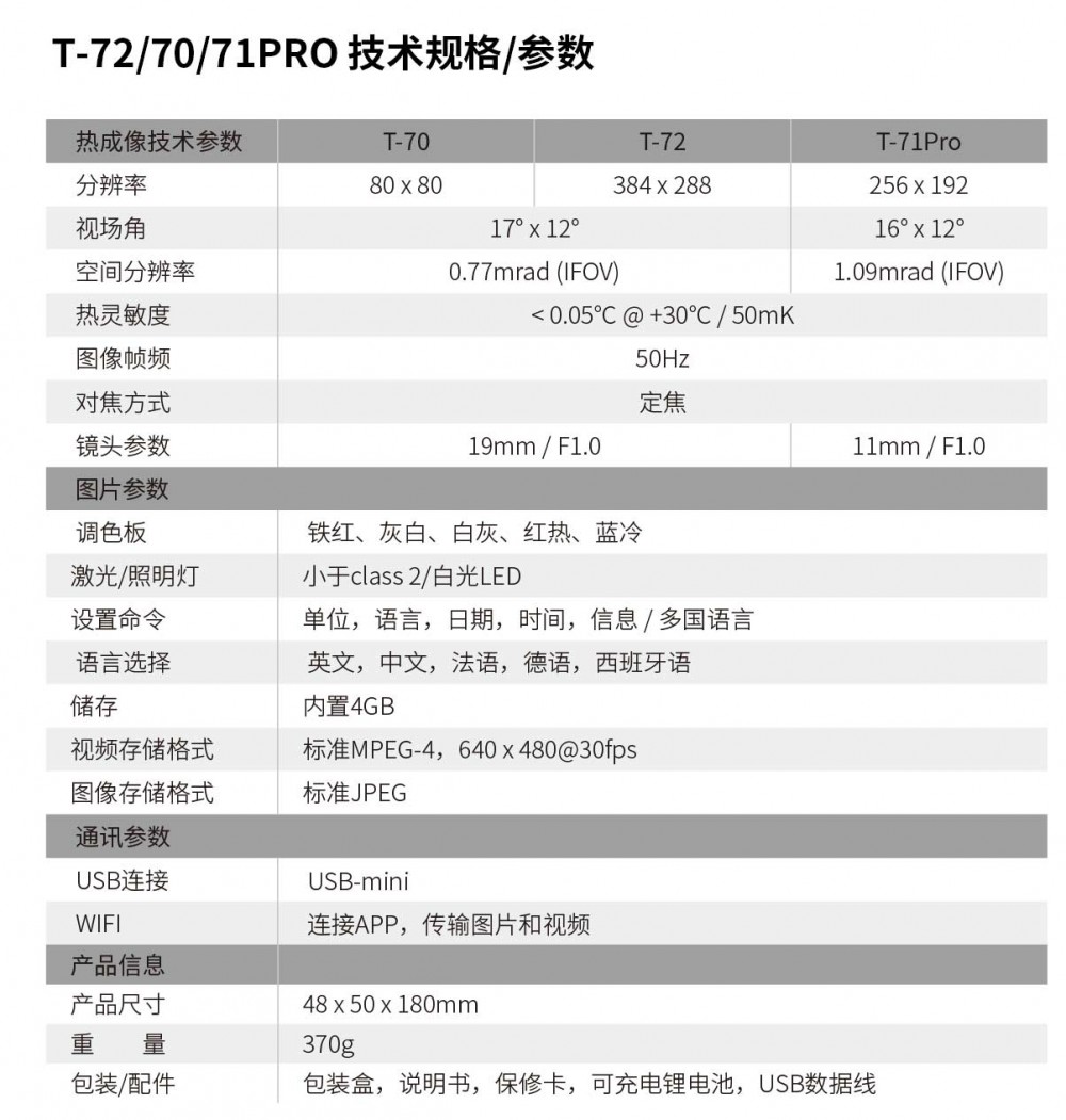 T-72系列户外热成像仪望远镜,是CEM华盛昌新设计、研发和制造的一款符合人体握感工程学新型单目红外热成像仪,384*288的高分辨率(T-71Pro为256*192,T-70为80*80)、50Hz红外图像帧频,确保高质量成像和图像的极致流畅,是野外考察、户外观测、工农业户外巡检的可信赖的户外热成像仪望远镜。