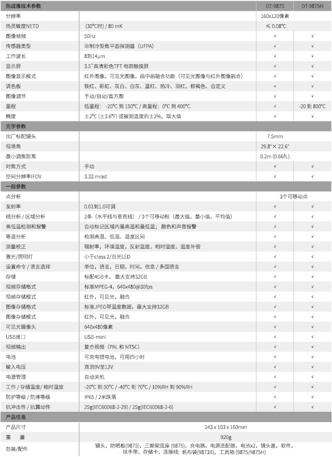 DT-9875/9875H 160*120红外热像仪采用非制冷焦平面红外探测器,50Hz图像帧频,640*480超像素显示,手动调焦镜头,可将被测物体的红外热谱图以高清晰度、高灵敏度的伪彩图像方式呈现在您的面前;对于静态、动态物体的测量工作易如反掌;还可将图像、视频和语音存储在Micro SD卡上,便于计算机进行深度分析和统计。