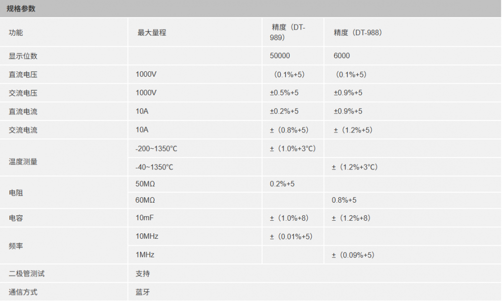 CEM DT-988\989是CEM华盛昌新设计、研发和生产的工业级专业彩屏真有效值数字万用表系列,双注塑机壳、IP67防护等级、彩屏设计、真有效值测量、蓝牙通讯、6000位和50000位可选,可承受3米跌落,满足高精度和复杂环境测量的用户需求。