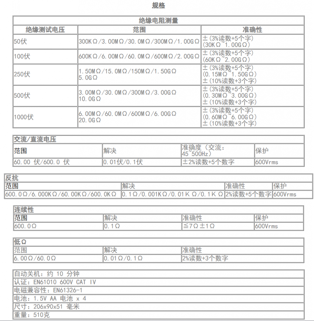 • 绝缘测试电压为 50V、100V、250V、500V 和 1000V
